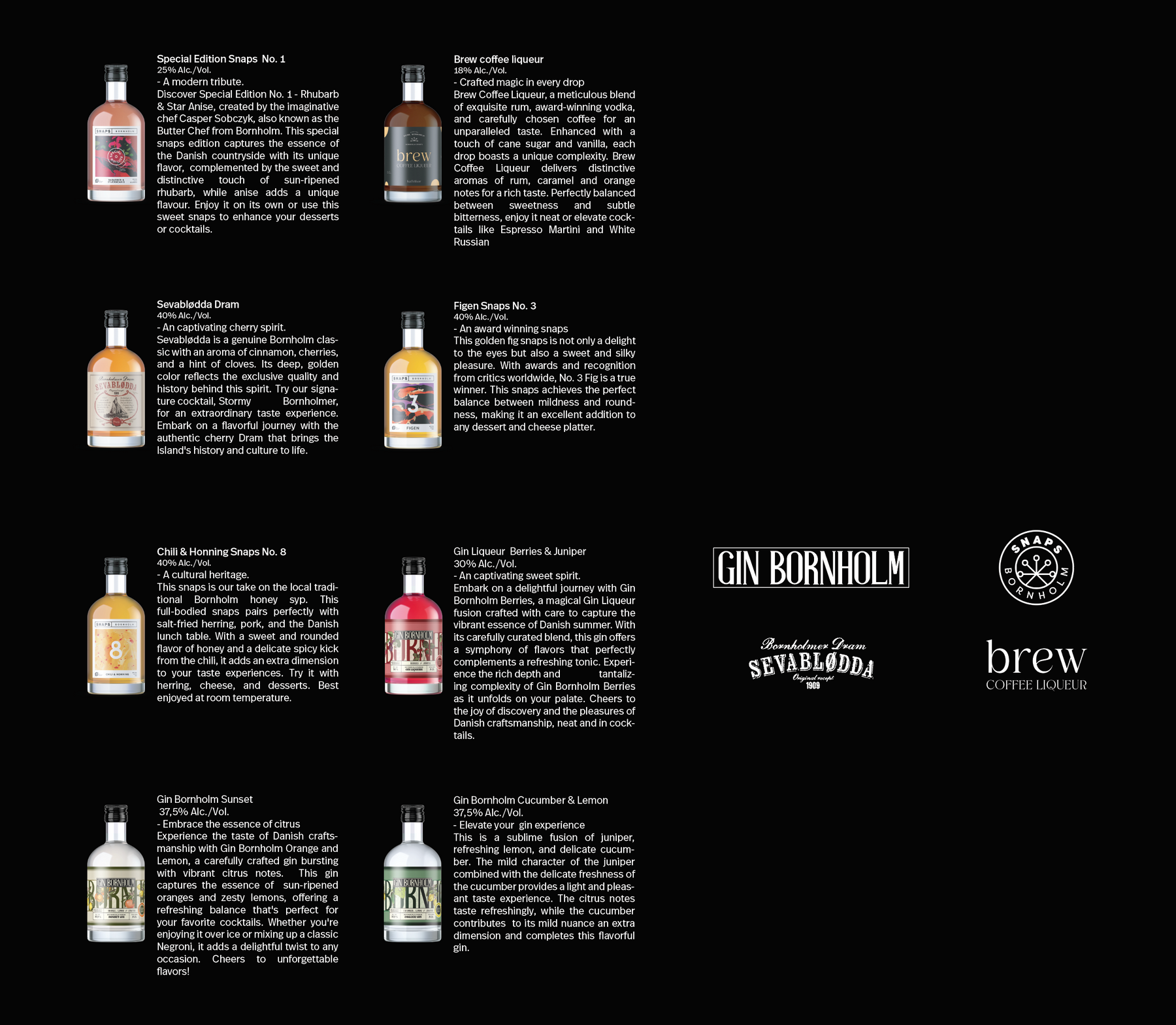 Skabt i samarbejde med den innovative kok Casper Sobczyk – også kendt som Smørkokken fra Bornholm. Denne moderne snaps indfanger essensen af det danske sommerland med friske noter af rabarber og et elegant strejf af stjerneanis. En let sødmefuld og aromatisk snaps, der både kan nydes ren eller bruges i desserter og cocktails.