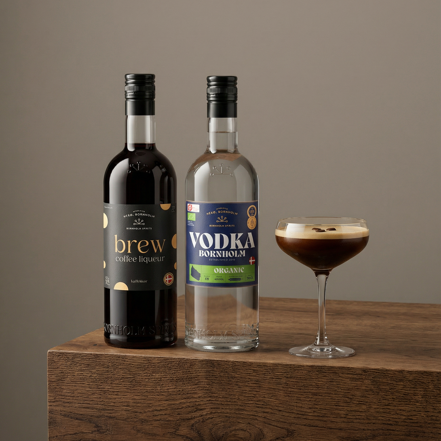Med Espresso Martini Cocktailsættet er du godt på vej! Cocktailsættet består af 1 flaske Brew Kaffelikør og 1 flaske økologisk Vodka Bornholm.